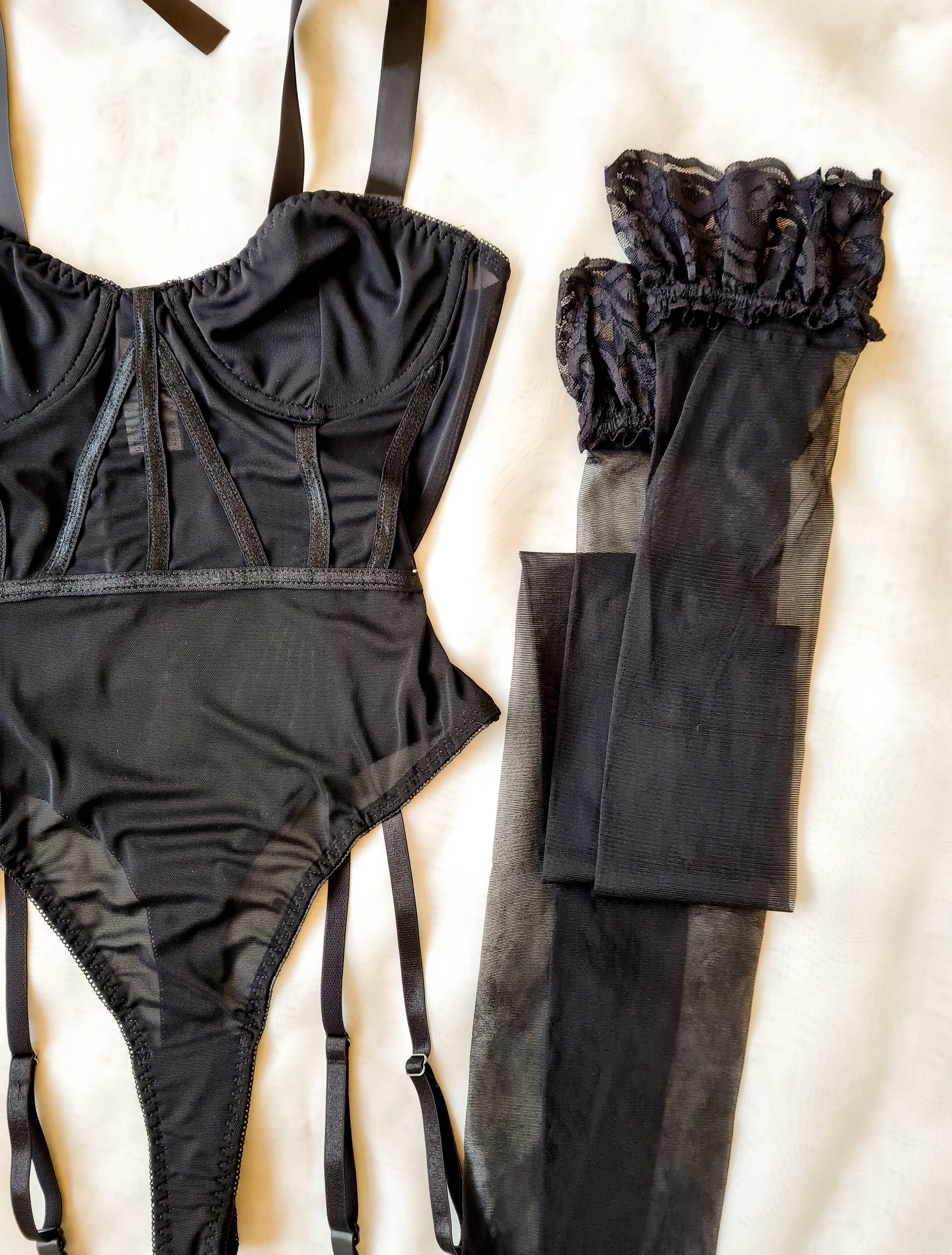 Bodysuit Adelaida es un body liguero de transparencia, tiene forro en el busto, tiene barbas en las copas, y tiene un detalle muy coqueto de cintas en vez de breteles. El corte es alto y el calzón colaless, incluye medias que puedes ajustar con el portaligas incorporado.