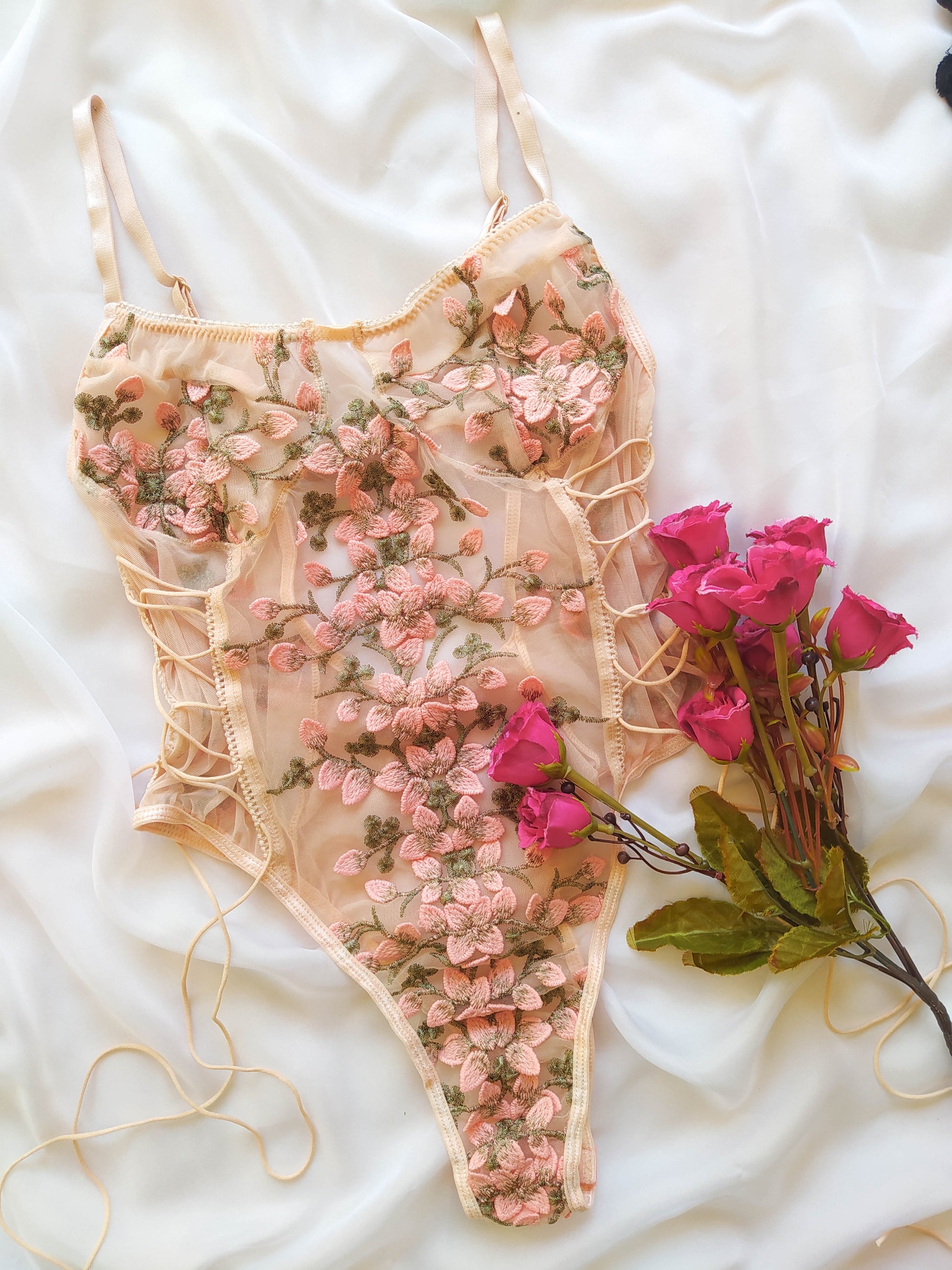 Bodysuit con bordado floral y anudado lateral. Este body tiene broches en la parte inferior, breteles ajustables y ajuste en la espalda. No tiene barbas, copas ni forro, por lo que trasparenta en la zona del busto. Viene en colores negro, blanco, gris, rosado, amarillo. Fernanda usa la talla M.